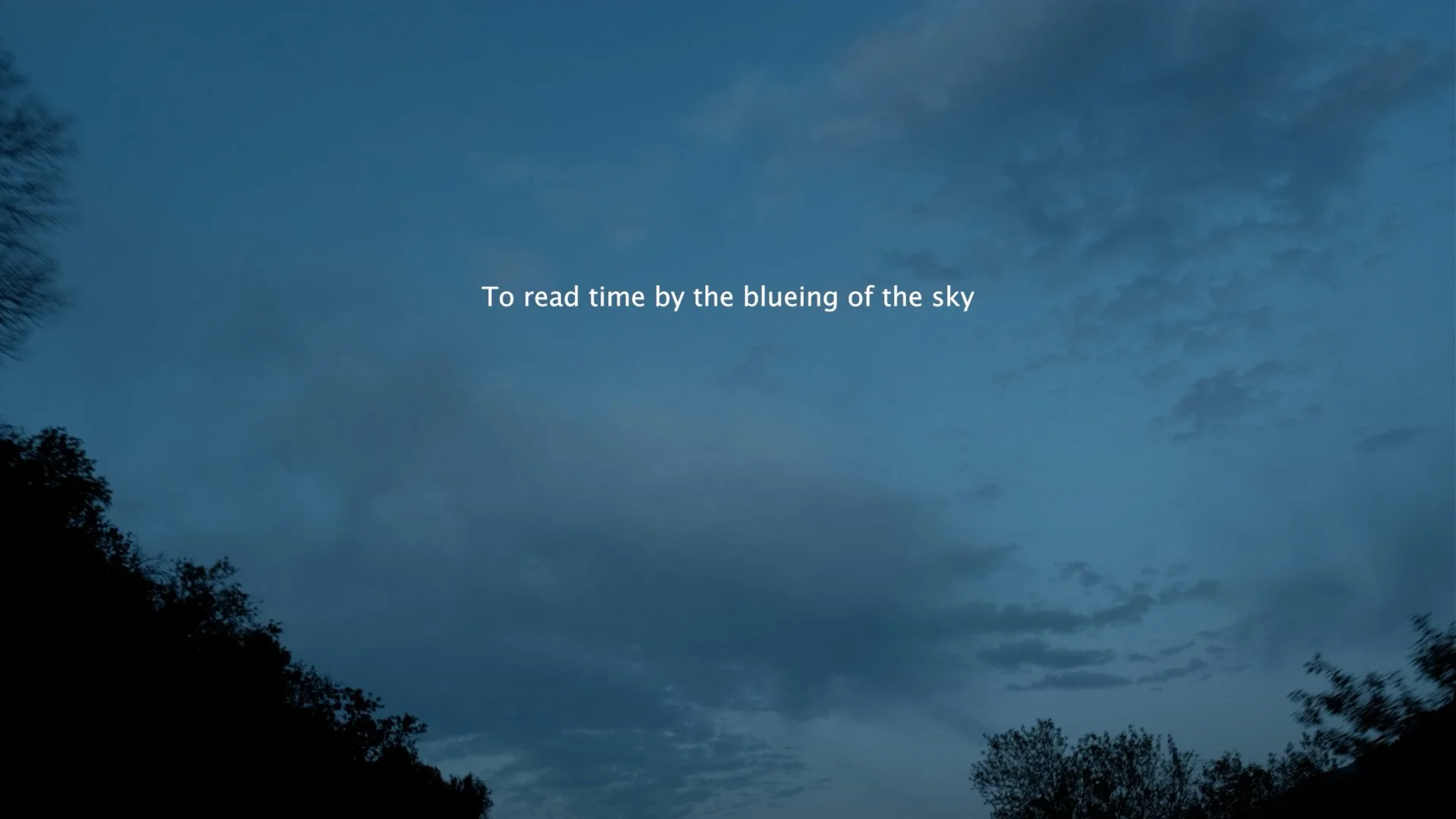 The film’s shades of blue immerse the viewer in the subtle intelligence of gradients and spectrums. Twilight draws the witness beyond the binaries of day and night, light and darkness, offering a form of wisdom drawn from the situated, everyday cycles we inhabit.